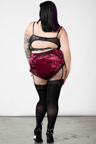 Make them beg for your attention in our ‘Mercy’ lace garter belt. Crafted in soft stretch, luxe velvet with lace trim and finished with metal rivet details and adjustable suspender straps. Perfect for play dates with the devil, dancing barefoot under the moon or a coven sleepover.